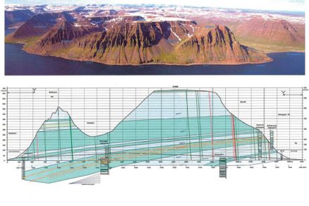 Obr. 1 Cesta č. 61 medzi obcami Bolungarvík a Hnífsdalur (dole geologický profil tunela)