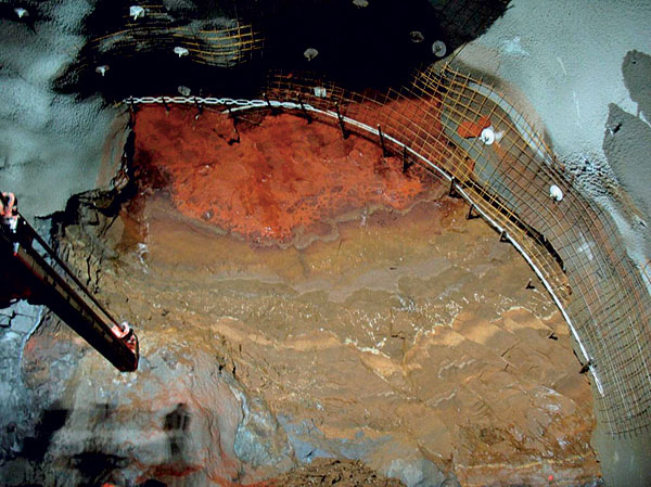 Razenie pokračovalo v rýchlom tempe na obidvoch portáloch a v novembri 2008 sa vyrazilo prvých 1 000 m s dosiahnutým denným postupom asi 10 m na každom portáli. Rozpojená hornina sa odvážala z tunela na skládky blízko obidvoch portálov a používala sa na novovybudované úseky cesty. Primárne (a zároveň definitívne) ostenie pozostávalo zo striekaného betónu s oceľovými drôtikmi a skalných kotiev. Geologický prieskum sľuboval dobré podmienky na razenie v kompaktnom lávovom čadiči s predpokladanou priemernou hrúbkou striekaného betónu 5 cm a len so sporadickými kotvami. Obavy z veľkého prítoku vody sa, našťastie, nenaplnili. Voda sa objavovala iba sporadicky v časti tunela z východného portálu. Vážne problémy však začali predstavovať vrstvy sedimentov s preplástkami lignitu (obr. 2), ktoré začali zostupovať od nadložia západného portálu. Ich nepravá mocnosť dosahovala miestami až 17 m.