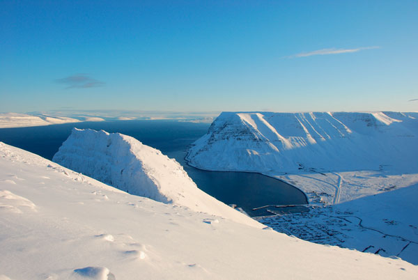 | Obr. 2 Nafáranie tufitických sedimentov | Obr. 3 Pohľad na západný portál pri obci Bolungarvík |