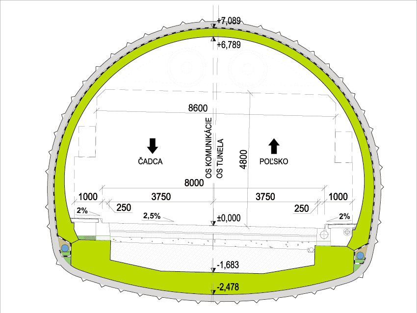 V oboch prípadoch sme priečne rezy hlavných tunelov, únikových štôlní a priečnych prepojení zjednotili. Tunely sa budú raziť metódou NRTM so zabezpečením dvomi vrstvami ostení. Medzi primárnym a sekundárnym ostením je hydroizolačná fólia. V tuneloch sa nachádzajú dva totožné typy výklenkov. Čistiace výklenky budú umiestnené obojstranne vo vzdialenosti maximálne 62,5 m. Druhým typom výklenkov sú združené výklenky. Do takýchto výklenkov sa umiestnia požiarny hydrant, SOS hláska a šachta na čistenie drenáže. Tieto výklenky budú na pravej strane v smere Čadca – štátna hranica SR/PR.