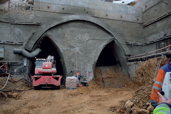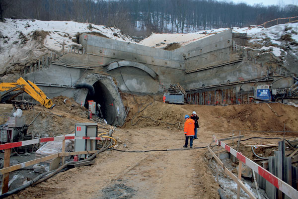 Firma Skanska SK a. s., Závod Tunely, vykonáva raziace práce zo severného (výjazdového) portálu. Keďže je severný portál umiestnený v hlbokej eróznej ryhe vyplnenej nestabilnou zeminou (obr. 1), bolo nevyhnutné zabezpečiť zvislé steny stavebnej jamy sústavou zvislých mikropilót vybavených vrstvou striekaného betónu s hrúbkou minimálne 15 cm a zemnými kotvami s dĺžkou 24 až 30 m (obr. 2, 3, 4). Ďalej je tu zabudovaná masívna pilótová stena z pilót ∅ 1 200 mm, ktorá chráni stavebnú jamu počas výstavby a tvorí opornú konštrukciu dolnej klenby hĺbeného úseku tunela. Pilótová stena zároveň tvorí základ zárubnej steny portálu vedľa budúcej koľaje.