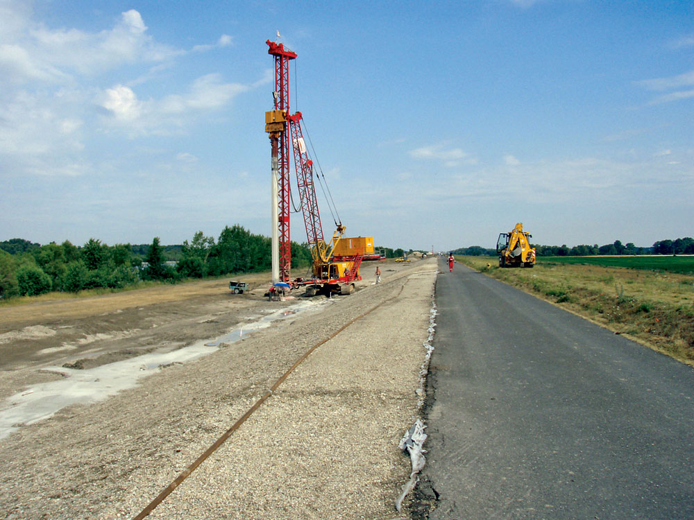 Obr. 5 Ľavostranná hrádza odpadového kanála – budovanie podzemnej tesniacej steny a tesnenia hrádze