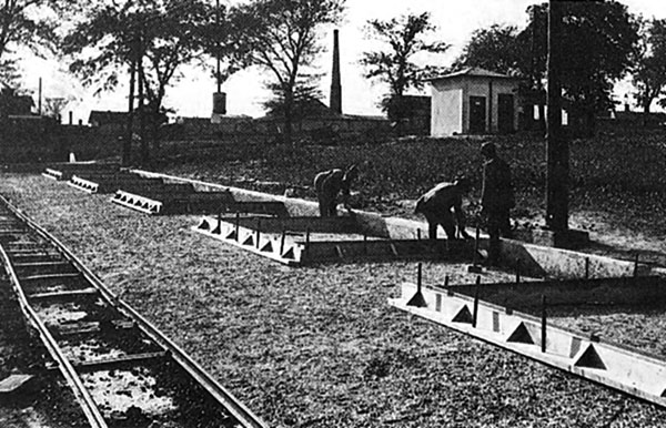 Zmes sa ukladala vo dvoch vrstvách a zhutnila sa pneumatickými ubíjadlami. Kamenivá pre vrchný betón mali stálu krivku zrnitosti s maximálnym zrnom s veľkosťou 25 mm. Prídavok cementu bol 350 kg na m3 hotového betónu. Vrchný betón sa zhutnil pneumatickými ubíjadlami, následne sa pomocou ťažkých železných dosiek profilovo správne ubíjal a nakoniec sa povrch krytu vozovky vyhladil pásom plachtoviny [1] (obr. 3).