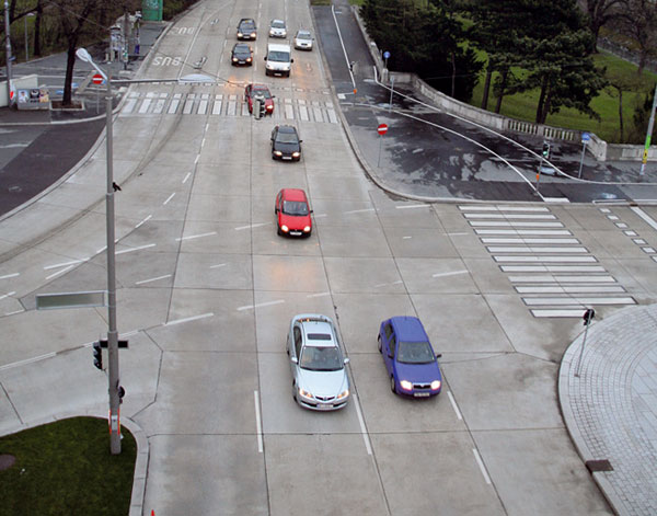 • Oblasti križovatiek/priestory dopravnej zápchy: keďže nedochádza ku vzniku vyjazdených koľají v zónach brzdenia a rozbehu, zabezpečuje sa správne odvádzanie povrchovej vody a jazdný komfort križujúcej sa premávky sa výrazne zvyšuje (obr. 7, 10).