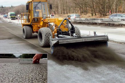 Na vyrovnaný povrch sa potom z pracovnej plošiny najčastejšie nastrieka kombinovaný spomaľujúci a ošetrovací prostriedok (obr. 4), ktorý časovo predlžuje hydratáciu cementu v najvyššej vrstve (milimetrová oblasť) a súčasne bráni vysychaniu čerstvého betónu. Odporúčané množstvo je podľa jednotlivých výrobcov asi 200 až 250 g/m2. Keďže hĺbka upravovaná kefami závisí okrem iného aj od zloženia betónu, musí sa pre každé stavebné opatrenie skúškami priamo na stavenisku určiť ideálne množstvo nanášaného spomaľovacieho prostriedku. Ak je nanesené množstvo príliš malé alebo ak sa kombinovaný spomaľujúci a ošetrovací prostriedok nenastrieka rovnomerne a nepokrýva celú plochu, môžu pri odstraňovaní kefami nastať problémy, môžu vznikať napríklad „hladké miesta“.