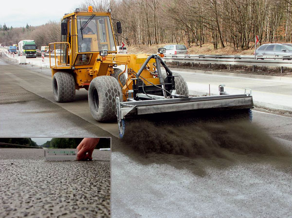 Hneď potom, ako je betón dostatočne zatvrdnutý a zjazdný, sa nezatvrdnutá povrchová malta odstráni kefou a dočistí motorom poháňanou oceľovou kefou, takže vznikne vyrovnaná plocha z vymývaného betónu, na ktorej je vidieť hrubé kamenivo, napríklad frakcie 5/8 (obr. 5) [10].