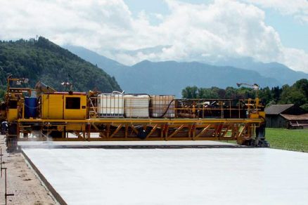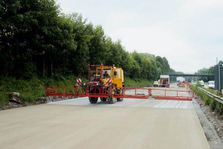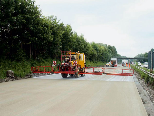 Pretože ochrana proti odpareniu, nanesená v kombinácii so spomaľovačom, sa s povrchovou maltou odstráni kefami, je nutné ďalšie ošetrenie povrchu betónu. Z tohto dôvodu sa hneď po odstránení nezatvrdnutej povrchovej malty nastrieka z mobilného nosníkového zariadenia na betónový povrch ošetrovací prostriedok (obr. 6). Pri vysokých teplotách a/alebo vysokých rýchlostiach vetra sa musí vykonať aj ošetrenie povrchu betónu.