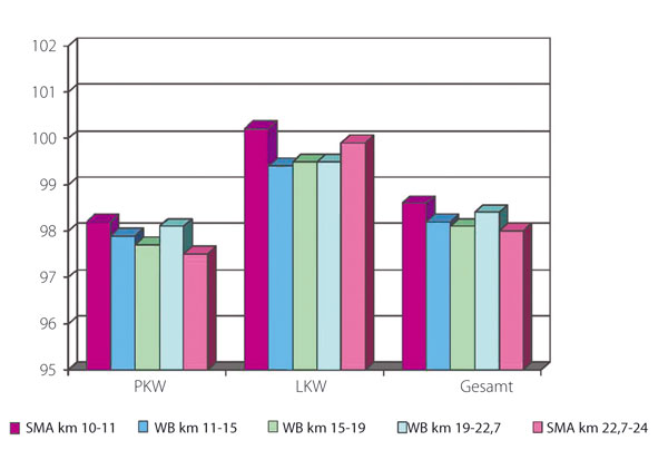 Bolo evidentné, že frekvenčné zloženie vymývaného betónu (WB) a priľahlého drvového asfaltového mastixu 0/8 S (SMA) sa len nepatrne odlišujú. Znižovanie hluku vymývaného betónu sa tiež nachádza v rozmedzí SMA [12]. Merania tiež preukázali, že hluk znižujúci účinok povrchu vymývaného betónu je pre pneumatiky nákladných vozidiel výraznejší ako pre pneumatiky osobných vozidiel.