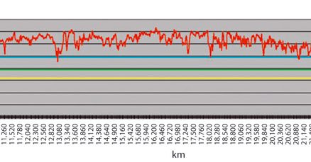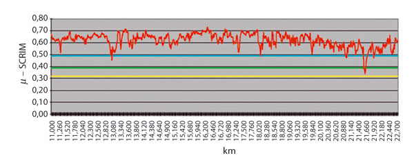 Výsledky nad úrovňou požiadaviek dosiahla aj drsnosť povrchu vozovky (modrá čiara) (obr. 8). Povrch betónu nespĺňal požiadavky len na úseku dlhom sto metrov. Dôvodom horšej kvality povrchu boli problémy s prístrojom počas jeho realizácie.
