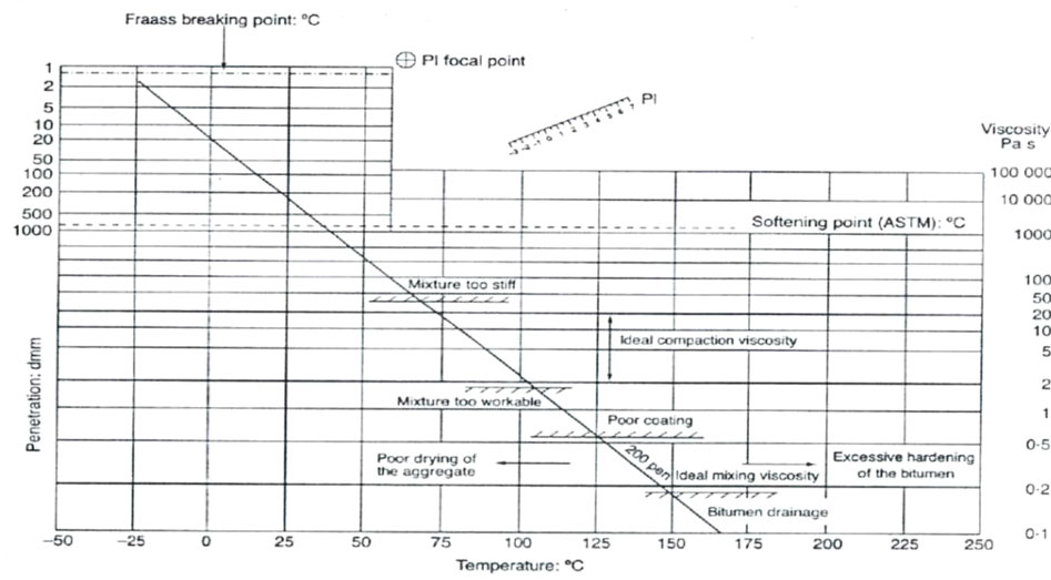 Obr. 2  Príklad výsledku základných skúšok bitúmenu a nadväznosť na optimálne pracovné teploty asfaltovej zmesi [10]
