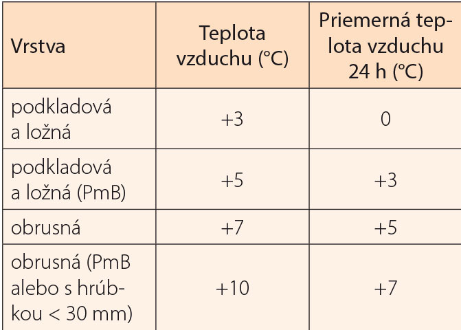 Tab. 1 Požiadavky TKP 6 na klimatické podmienky pri ukladaní asfaltových zmesí