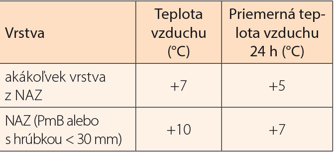 Tab. 4 Požiadavky TKP 41 na klimatické podmienky pri ukladaní NAZ