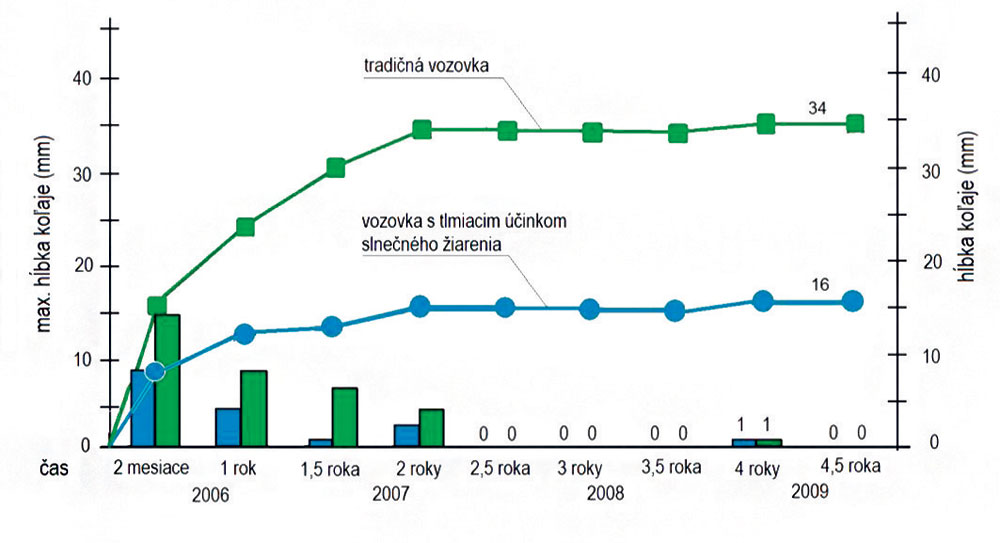 Veľmi dôležité a sledované boli merania hĺbky koľají (trvalých deformácií), ktoré sa vytvárali na povrchu oboch porovnávaných konštrukcií asfaltových vozoviek. Merania, ktoré sa vykonávali počas používania vozoviek dlhšie ako štyri roky, sú graficky znázornené na obr. 5. Rozdiel v hodnotách hĺbky koľají sa ukázal už po dvoch rokoch. Tie boli 14, respektíve 32 mm. V ďalšom období bol nárast hĺbky koľají menší, asi po troch rokoch boli hodnoty 16, respektíve 34 mm. Toto meranie a jeho hodnotenie ukázali, že koľaje vozovky s účinkom tlmiacim slnečné žiarenie mala iba polovičnú hodnotu ako koľaje na štandardnej konštrukcii. Opatrenie možno hodnotiť ako veľmi efektívne, ktoré môže ovplyvniť náklady na obnovu prevádzkovej spôsobilosti asfaltových vozoviek.