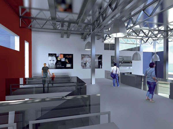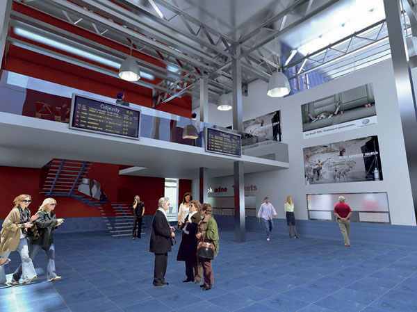 Hlavným motívom bolo navrhnúť centrálny otvorený priestor s priznanými konštrukciami ako priamy odkaz na technické poslanie prevádzky. Aby sme v pomerne veľkej budove zvýraznili časť pre verejnosť, ako dominantná bude takmer celozasklená hala, v ktorej sa sústreďuje hlavný pohyb verejnosti. Hala sa navrhla s priznanou nosnou oceľovou konštrukciou, ako aj rozvodmi vzduchotechniky. Súčasťou haly je galéria umožňujúca prechod do čakární. Celý interiér sa riešil ako ľahký a vzdušný priestor s priehľadmi do exteriéru a dostatkom voľných vertikálnych plôch na umiestnenie potrebných oznamovacích a informačných systémov, potrebných pre život stanice.