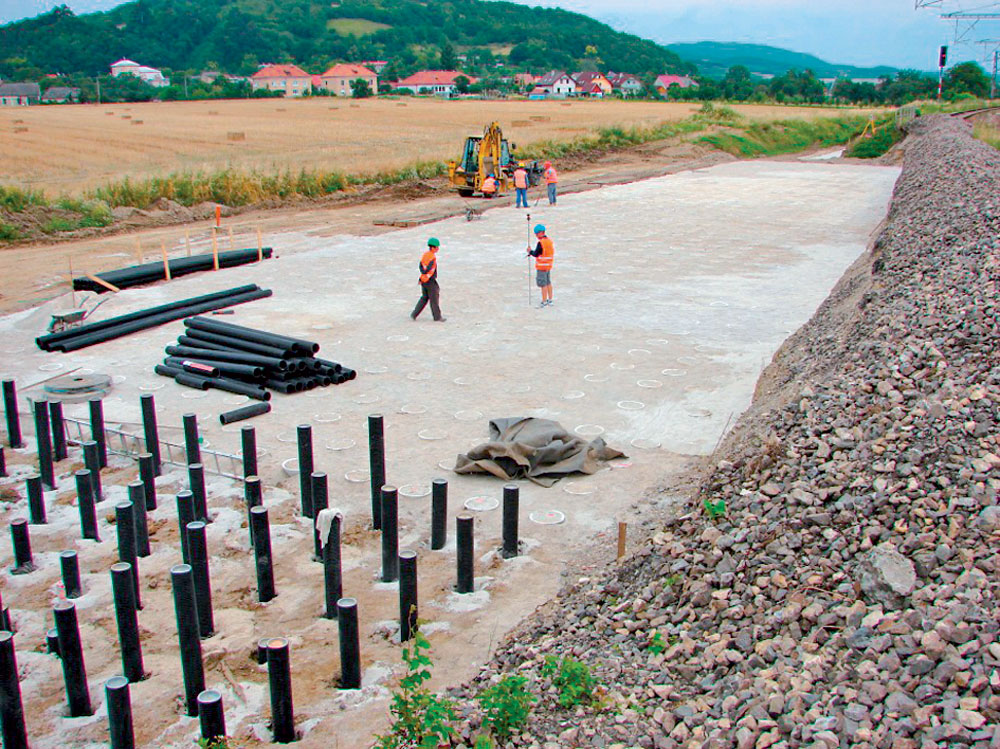 V prípadoch, keď ide o rekonštrukciu existujúcej trate, ktorá je v prevádzke, je to už zložitejšie, navyše ak sa v podloží nového násypu vyskytnú nevhodné zeminy s vysokou plasticitou a nízkou únosnosťou. Tak to bolo aj na úsekoch trate priľahlých k tunelu Turecký vrch z južnej a severnej strany. Pre tesnú blízkosť starej prevádzkovanej trate nebolo možné vymeniť podložie do hĺbky asi 4 m, pretože hrozilo zosunutie starej trate. Preto sa zvolilo na Slovensku dovtedy nepoužité riešenie vybudovania základu násypu z koberca mikropilót s rastrom 0,80 až 1 m. Tak vznikol úplne tuhý základ nového železničného telesa, ktorý eliminuje možné nežiaduce sadanie podložia. Systém má názov Augeo a má pôvod v Holandsku.