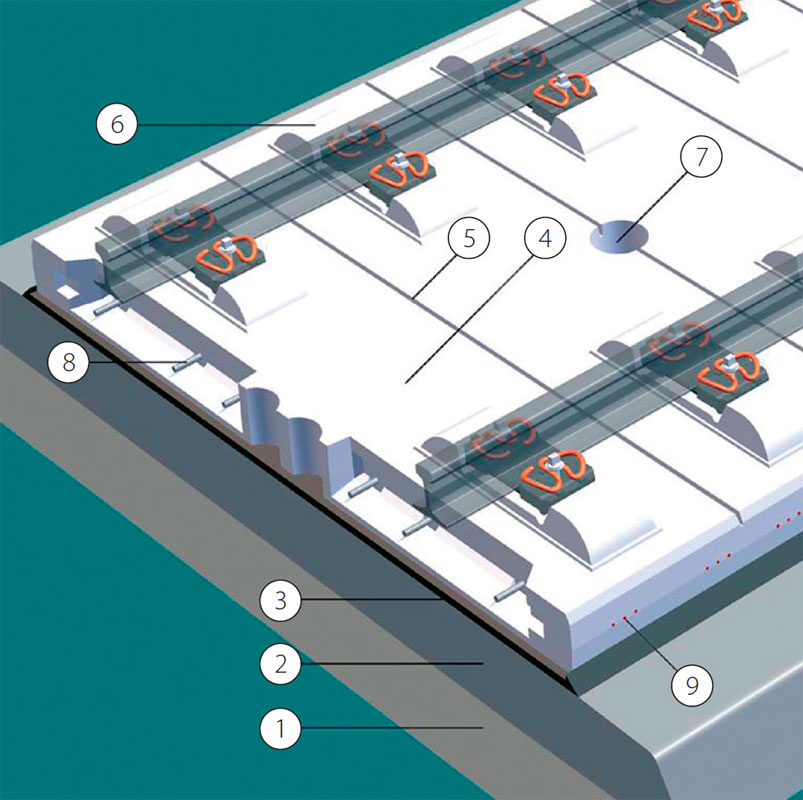 Ide o systém železničného zvršku, kde je klasické riešenie, pri ktorom sa koľajový rošt (koľajnice s priečnymi podvalmi) uloží do štrkového lôžka, nahradené nosnou železobetónovou doskou, v ktorej sú koľajnicové podpory s uzlami upevnenia zabetónované a trvalo polohovo fixované. Nosná železobetónová doska ešte leží na hydraulicky stmelenej nevystuženej doske, ktorá slúži na roznos zaťaženia do pláne zemného telesa a súčasne vytvára vyrovnaný podklad pod zvrškovú dosku. Zvyčajne sa zhotovuje finišérom. Jej hrúbka je 300 mm. Ako spojivo v tejto vrstve sa používa cement (najrozšírenejšie riešenie) alebo asfalt.