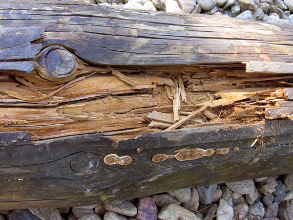 Vo vedľajšej časti pozostávajúcej z troch stĺpov nebolo možné identifikovať drevokaznú hubu tradičnými metódami, z toho dôvodu sa použili metódy molekulárnej genetiky. Vo dvoch sĺpoch bola takýmto spôsobom určená drevokazná huba pevnica škridlicovitá (Amylostereum areolatum).
