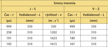 Tab. 1: Hodnoty merania stĺpu č. 10 pomocou rýchlosti šírenia ultrazvuku