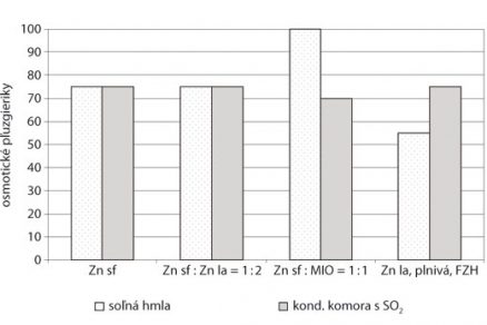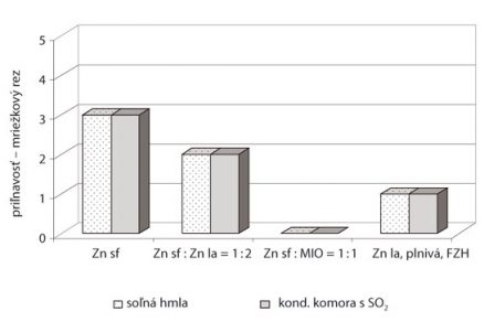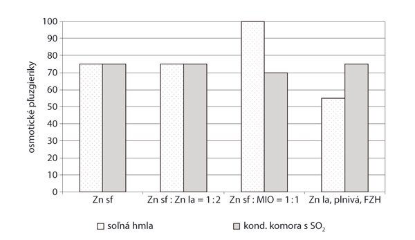 Najlepšia celková antikorózna účinnosť, vyššia ako 90 stupňov, sa po výše 1 500 hodinách vystavenia v soľnej hmle zistila pri náterovom systéme so zinkovou náterovou hmotou na báze kombinácie sférického zinkového prachu a železitej sľudy. Najnižšia celková účinnosť zo štyroch hodnotených náterových systémov sa stanovila pri systéme obsahujúcom okrem lamelárneho zinku aj plnivá a antikorózny pigment. Táto náterová hmota obsahovala najnižšie množstvo zinkového prachu. Celková antikorózna účinnosť všetkých náterových systémov po expozícii v kondenzačnej komore s SO2 bola vyrovnaná a dosahovala hodnoty vyššie ako 80 stupňov.