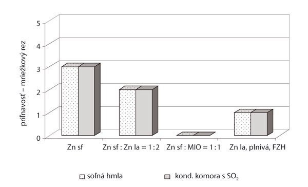 Pri náterovom systéme so základnou náterovou hmotou na báze kombinácie sférického Zn a MIO (1 : 1) sa nezistila po 1 512 hodinách expozície v soľnej hmle nijaká korózia podkladu. Je to zapríčinené lístkovou štruktúrou železitej sľudy a nerozpustnými koróznymi produktmi zinku. Nepatrná korózia podkladu sa pozorovala pri náterových systémoch obsahujúcich základné farby buď zo samotného sférického zinkového prachu, alebo z kombinácie sférického a lamelárneho zinkového prachu. Takisto systém so základnou náterovou hmotou na báze lamelárneho zinku, plnív a antikorózneho pigmentu mal odolnosť proti korózii podkladu na stále vysokej úrovni. Náterové systémy so všetkými štyrmi hodnotenými zinkovými antikoróznymi náterovými hmotami, vystavené v kondenzačnej komore s SO2, mali rovnakú účinnosť proti podkorodovaniu.