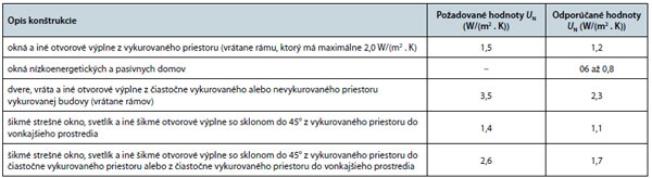 V ostatných rokoch sa postupne sprísňovali požiadavky na prechod tepla obvodovými konštrukciami. Súčasné funkčné požiadavky na konštrukcie otvorových výplní sú uvedené v STN 73 0540-2: 2012 (Tepelná ochrana budov. Tepelnotechnické vlastnosti stavebných konštrukcií a budov. Časť 2: Funkčné požiadavky). Tieto požiadavky sú zhrnuté v tab. 1 a udávajú požadované a odporúčané hodnoty súčiniteľa prechodu tepla – UN (W/(m2 . K)).