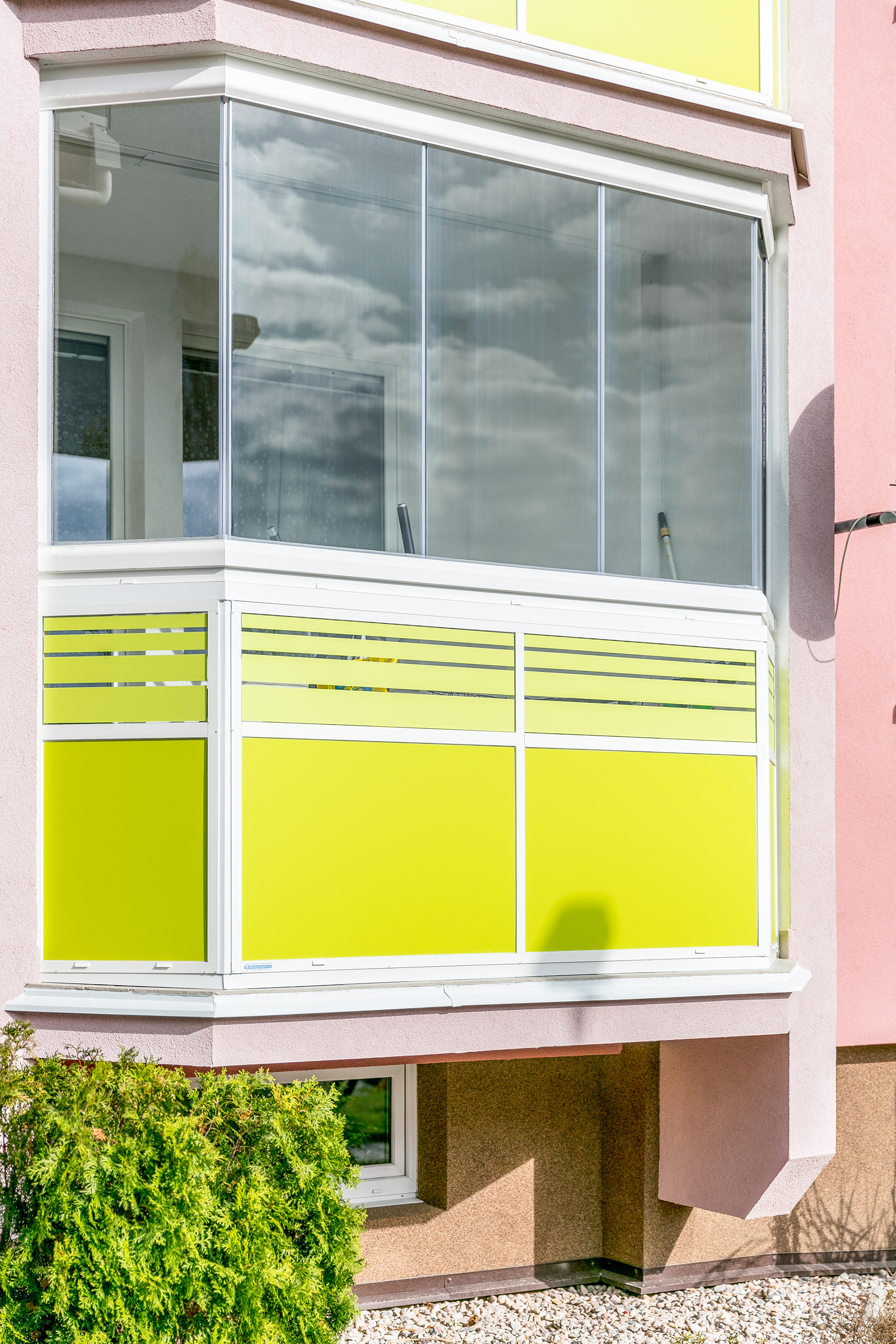 Časy, keď sa jednotlivé domy na sídlisku predbiehali v krikľavosti navzájom neladiacich fasád, sú preč. Omnoho elegantnejšiu premenu vzhľadu ponúkajú hliníkové zábradlia s farebnou výplňou. Zábradlie obyvateľom zaisťuje bezpečnosť, súkromie, ale zároveň má prepúšťať svetlo a pri posedení nebrániť vo výhľade. Riešením sú priehľadné sklenené prvky. Zábradlie zaujímavo rozčlenia a opticky odľahčia. Farebnosť výplne by mala koncepčne nadväzovať na fasádu. S výraznou farbou fasády ladí výplň z mliečneho skla, naopak, dom s nenápadnou fasádou si môže dovoliť sýtejšie a krikľavejšie balkóny.