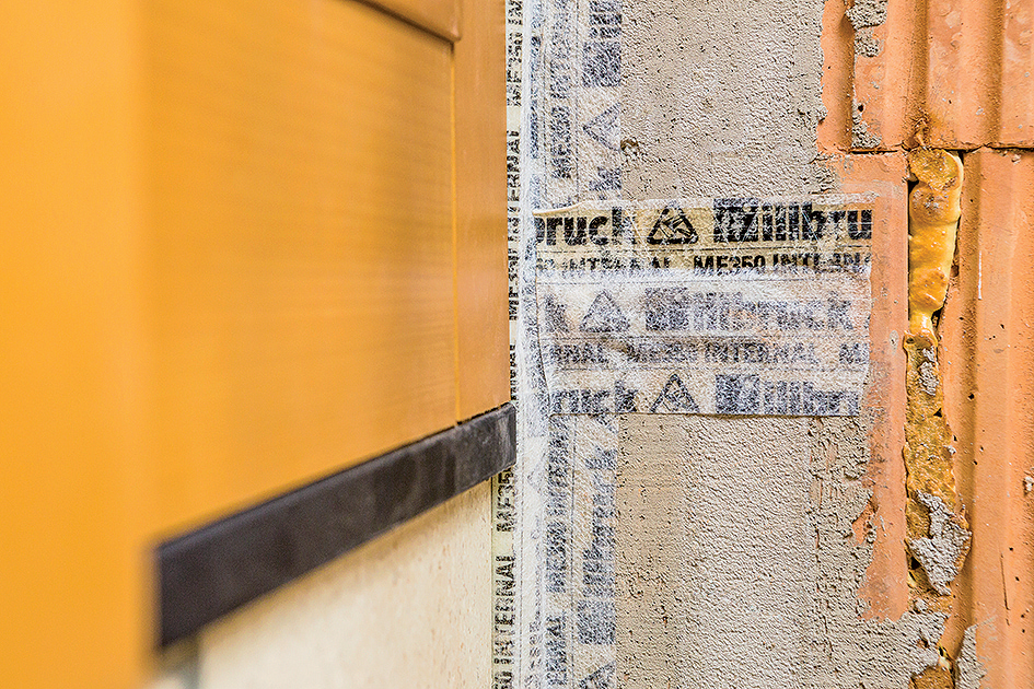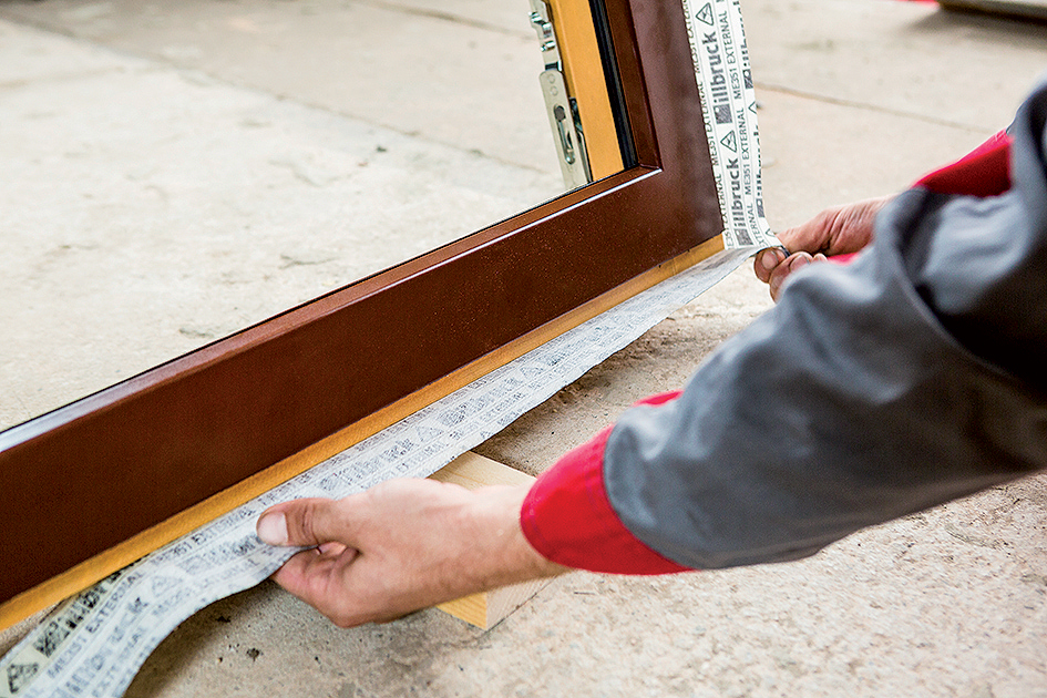 Po zvesení okenných krídel a dôkladnom očistení obvodového rámu od prípadných nečistôt a prachu sa nalepí po obvode okenného rámu izolačná páska s presahom na šírku škáry.
