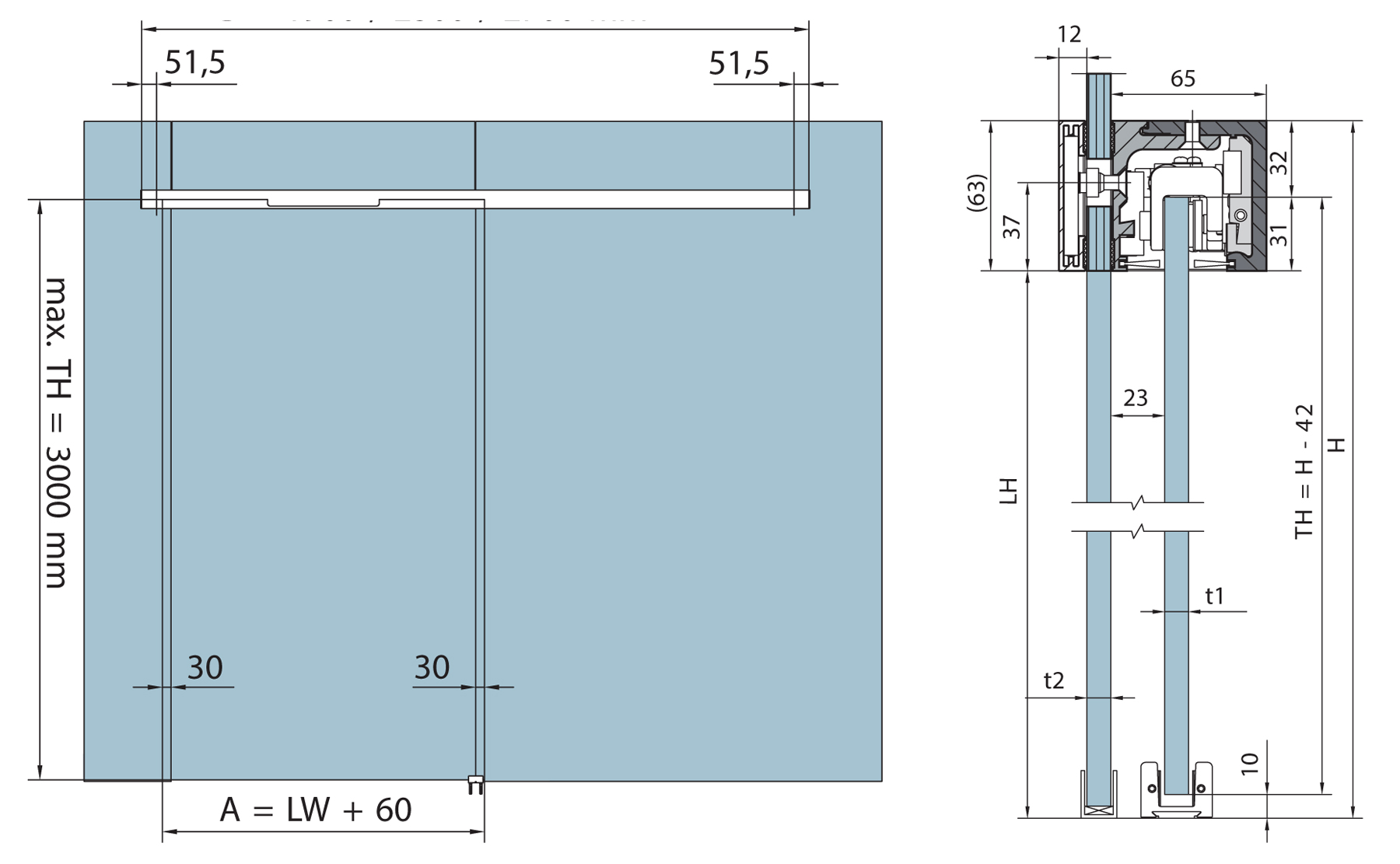 Dizajnérsky veľmi elegantné riešenie vo funkcionalistickom štýle prináša posuvný systém Premium (J.A.P. Slovakia). Nosná hliníková dvojkoľajnica s nosnosťou do 130 kg je ukotvená priamo do nosného stropu pomocou závitovej tyče a matíc, jej konštrukciu však nevidno, zakrýva ju stropný podhľad. Výška dverných krídel siaha od podlahy až k stropu, ich hrúbka sa môže pohybovať medzi 3 až 5 cm. Dverná výplň môže byť sklenená s hliníkovým rámom alebo drevená. Maximálna dĺžka posuvnej lišty je 6 m, jednotlivé dielce sa môžu variabilne kombinovať. Zatvorené sa navzájom prekrývajú 2 cm.