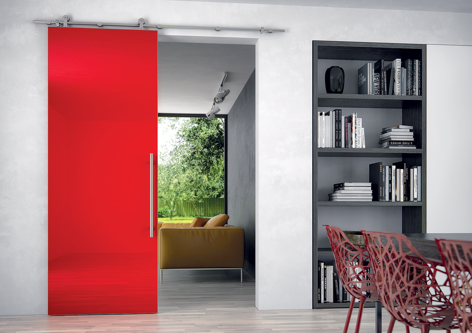Technicky aj dizajnérsky čisté riešenie ponúkajú systémy bez krycích líšt, kde je posuvný mechanizmus priznaný. Základným prvkom je antikorová tyč, po ktorej sa pohybujú antikorové kladky s pripevneným dreveným alebo celoskleneným dverným krídlom. J.A.P. Slovakia ponúka tento systém pod názvom Rollo. Maximálna hmotnosť jedného dverného krídla je 80 kg, dvojkrídlové dvere je možné otvárať a zatvárať synchrónne. V ponuke Geze je podobný systém pod názvom Aerolan, nosná koľajnica sa však montuje na stenu alebo na strop a hmotnosť posúvaných sklenených alebo drevených krídel môže dosiahnuť 105 kg. Ďalšou možnosťou je systém RSP 80 (Dorma), ktorý má najmenej technický vzhľad, línie vodiacej lišty a úchytov sú elegantné, jemne zaoblené. Maximálna hmotnosť dverného krídla je 80 kg a šírka dverného otvoru 100 cm.
