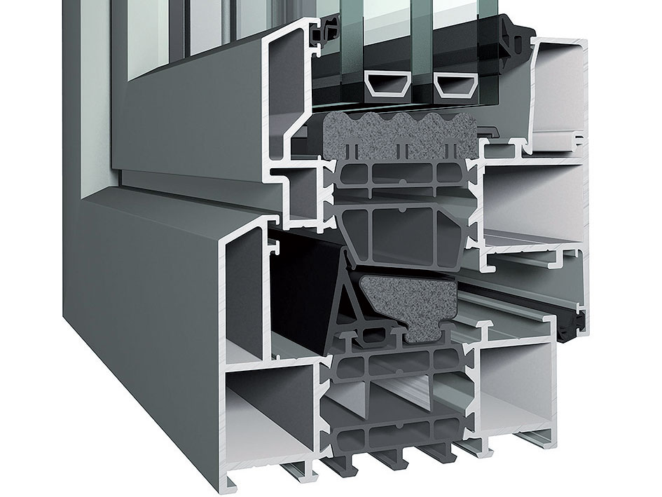 - Trojkomorový hliníkový systém s min. súčiniteľom prechodu tepla rámu Uf = 1,0 W/(m2.K), dva hliníkové poloprofily zlisované s prerušeným tepelným mostom na báze polyamidu, vystužený sklenným vláknom (skeletónový) s EPDM tesneniami vsadenými do systémovej drážky