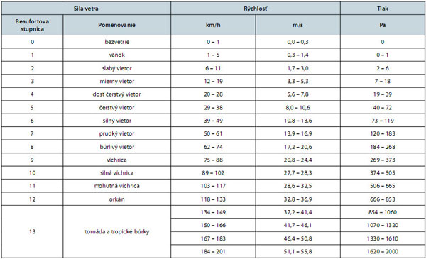 Tab.  Vzťah medzi tlakom a rýchlosťou vetra