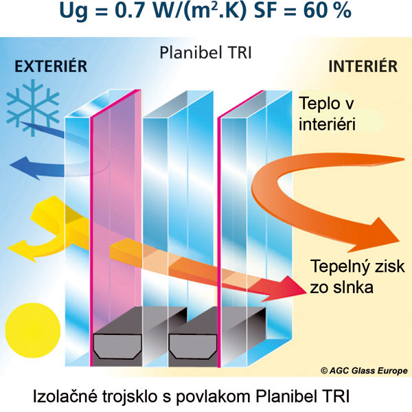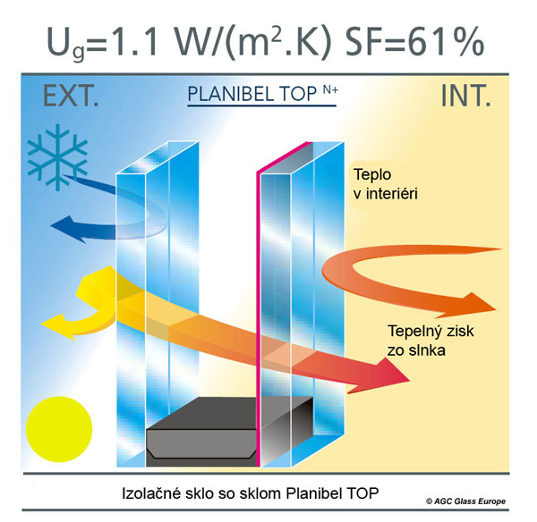 Túto hodnotu dosahujú sklá spoločnosti AGC, ktorými sú izolačné dvojsklo Thermobel Top N+ a izolačné trojsklo Thermobel TRI s použitím skiel Planibel TRI. Preslnenie pracovných priestorov je zvyčajne menej vítané, kým preslnený byt je znakom komfortného a zdravého bývania. V našich domovoch trávime čas prevažne v poobedňajších hodinách, teda v letnom období vieme intenzívne slnečné lúče regulovať pomocou žalúzií (možno zvoliť izolačné sklo s integrovanými žalúziami Thermobel Store). Naopak, na jar, na jeseň a v zime využijeme silu slnka a vyšší solárny faktor zasklenia ako bezplatný zdroj, ktorými si prihrejeme interiér. V chladnejších dňoch, vďaka nízkej hodnote súčiniteľa prechodu tepla zasklením, neuniká z interiéru zaplatené teplo von a súčasne sa nám miestnosť zadarmo prihrieva prírodným zdrojom, t. j. slnkom.