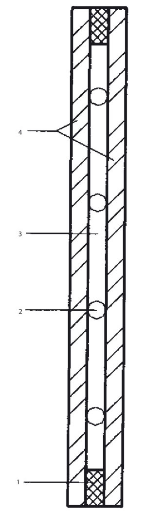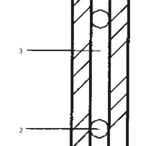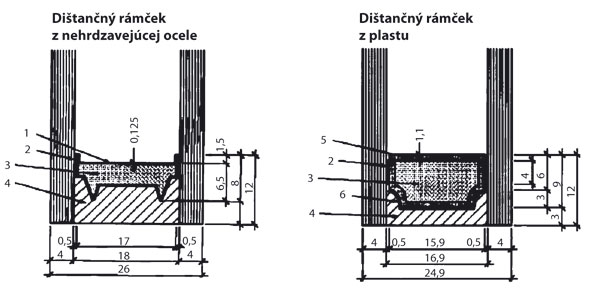 | Obr. 5: Rezy nízkoemisnými zaskleniami s použitím dištančných rámčekov na báze nehrdzavejúcej ocele a na báze plastu 1 – nehrdzavejúca oceľ, 2 – polyizobutylén, 3 – Silica Gel desiccant, 4 – polysulfid, 5 – polykarbonát, 6 – fólia s povlakom na báze nehrdzavejúcej ocele |