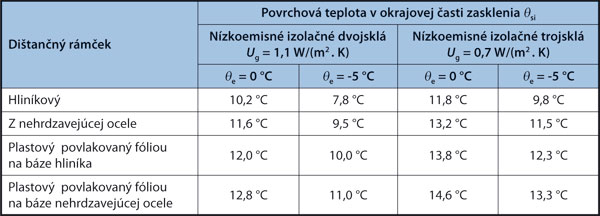 Tab. 7: Povrchové teploty v okrajovej časti zasklenia pri rôznych druhoch dištančných rámčekov (stanovené výpočtom podľa EN ISO 10077-2 pre drevené profily okien θi = 20 °C)