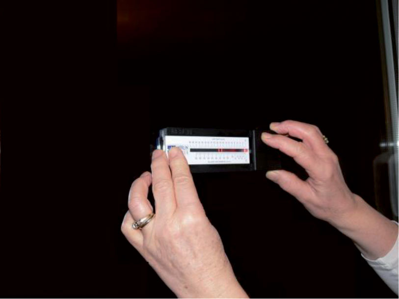 Združenie SLOVENERGOokno vlastní meradlo SPARKLIKE v2, ktorým je možné merať koncentráciu plynu nedeštruktívnou metódou (obr. 1). Problémom je meranie koncentrácie plynu v trojsklách alebo farbených izolačných sklách, pri ktorých nie je toto meradlo vhodné. Tu je k dispozícii iba deštrukčná metóda, pri nej sa vyberie izolačné sklo z rámu krídla okna, navŕta sa otvor s priemerom približne 3 mm a odoberie (odsaje) sa vzorka plynu na analýzu. Keďže súčiniteľ prechodu tepla izolačného skla závisí okrem koncentrácie plynu aj od šírky medzisklovej medzery, podmienkou na úspešné zistenie Ug je schopnosť zmerať šírku tejto medzery. K dispozícii je laserové meradlo na obr. 4. Na zistenie súčiniteľa prechodu tepla nepriehľadných konštrukcií v nestacionárnych podmienkach sa niekedy používa meradlo tepelného toku. Ponúka sa možnosť použiť ho aj na meranie súčiniteľa prechodu tepla izolačných skiel, a to najmä v prípadoch, ak použitie opísaných meradiel nie je možné (napr. farebné sklo, trojsklo, izolačné sklo vo fasáde, ktoré nie je možné vyňať z rámu a pod.).