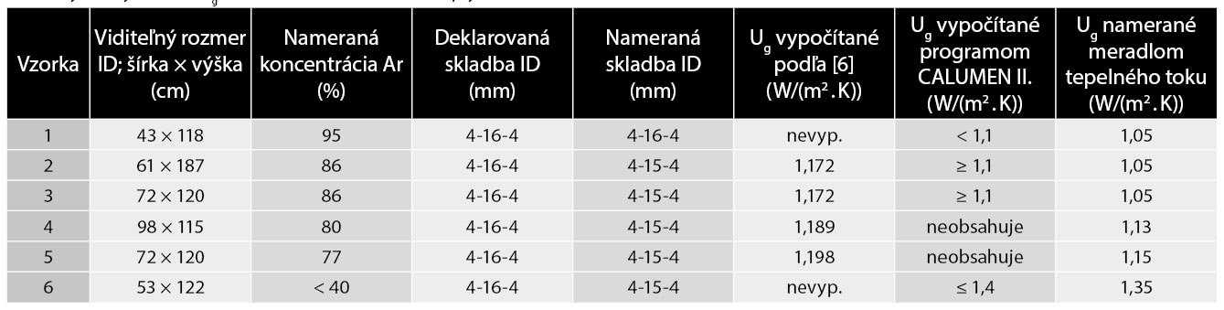 Najčastejšie spochybňovanou charakteristikou izolačných skiel je hodnota súčiniteľa prechodu tepla. Na reálne zabudovaných izolačných sklách v oknách sa vykonali merania uvedené v tab. 1. Z meraní vyplynula veľmi dobrá zhoda nameraného Ug s koncentráciou argónu. Pre meraný typ izolačného skla je podľa STN EN 673 vypočítaná hodnota 1,1 W/(m2 . K). Táto vypočítaná hodnota platí, ak koncentrácia argónu v izolačnom skle je minimálne 90 ± 5 %. Nami namerané hodnoty (vzorka 1 až 3) sú v tomto rozpätí. Takúto hodnotu (zaokrúhlene) možno dokonca prijať ešte pri koncentrácii plynu 80 % (vzorka č. 4). Pri znižovaní koncentrácie plynu sa preukázal výrazný pokles súčiniteľa prechodu tepla (vzorka č. 5 a 6). Keďže meradlo koncentrácie plynu dokáže preukázať spoľahlivé výsledky len od koncentrácie plynu 40 %, vložila sa do výpočtu podľa EN 673 v programe Calumen II. hodnota pre vzduch (vzorka č. 6). Meranie meradlom tepelného toku túto skutočnosť potvrdilo, v izolačnom skle sa nachádzalo zanedbateľné množstvo argónu.