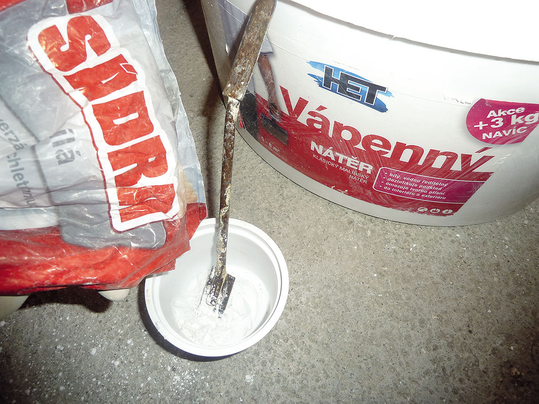 Po zabrúsení plôch sa môže realizovať prvý náter vápenným mliekom s vhodnou konzistenciou. Náter sa nechá mierne stuhnúť.