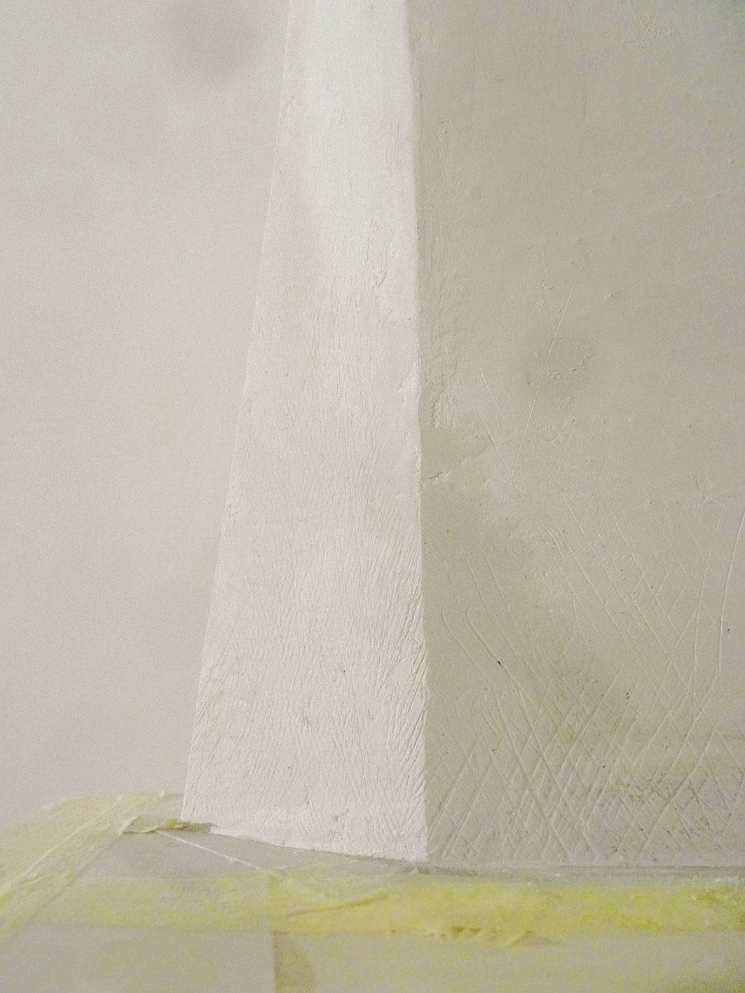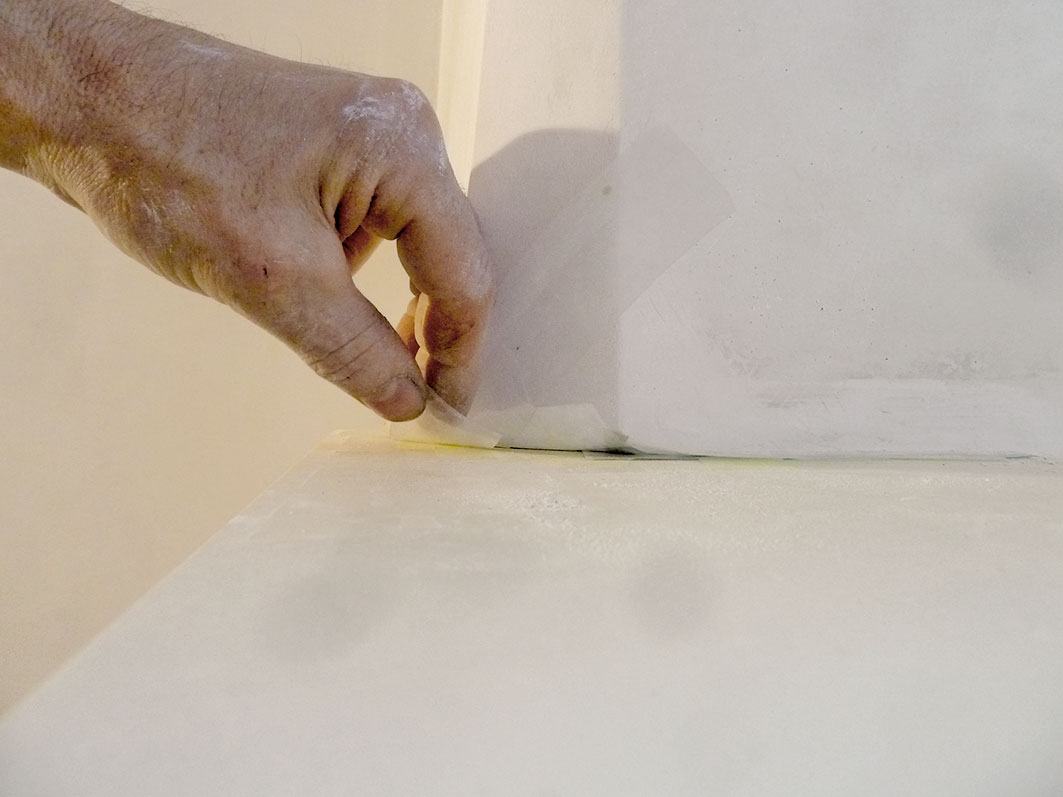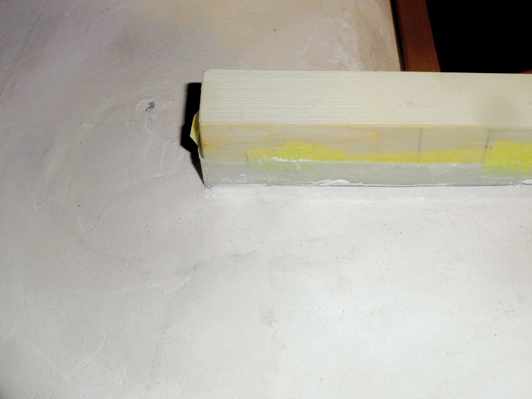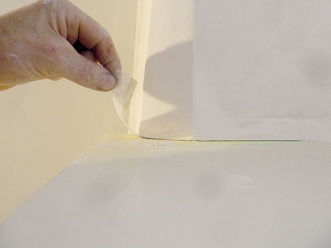 Maskovacia páska, ktorá prečnieva pred plochy ostenia, sa jemne oreže. Prípadná stopa po noži neprekáža – vápenné nátery treba počas rokov obnovovať.