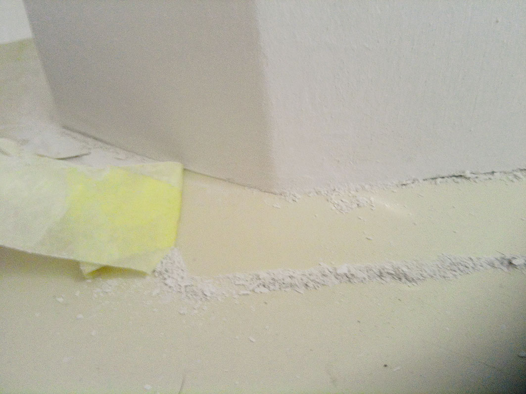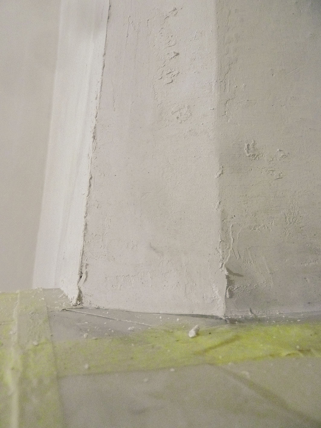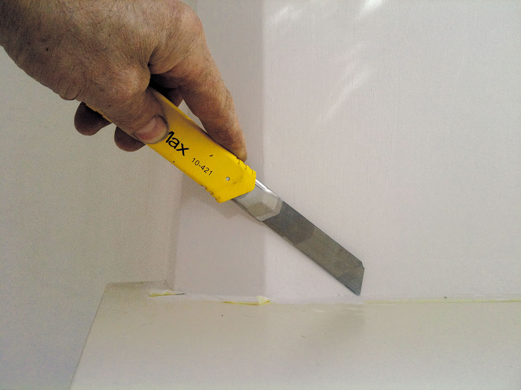 Maskovacia páska, ktorá prečnieva pred plochy ostenia, sa jemne oreže. Prípadná stopa po noži neprekáža – vápenné nátery treba počas rokov obnovovať.