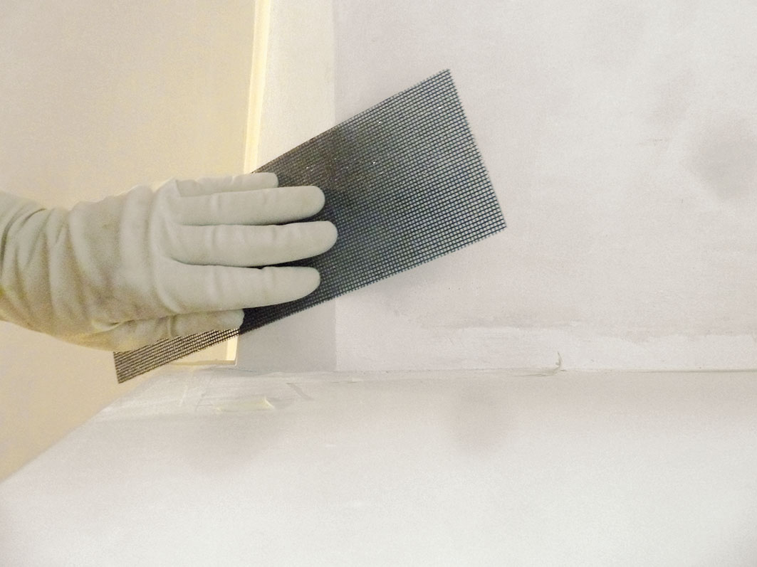 Povrch sa následne dôkladne zarovná brúsnou sieťkou, ktorá sa používa pri realizácii sadrokartónových konštrukcií. Rozdiel je v tom, že sa pracuje s mierne vlhkým povrchom.