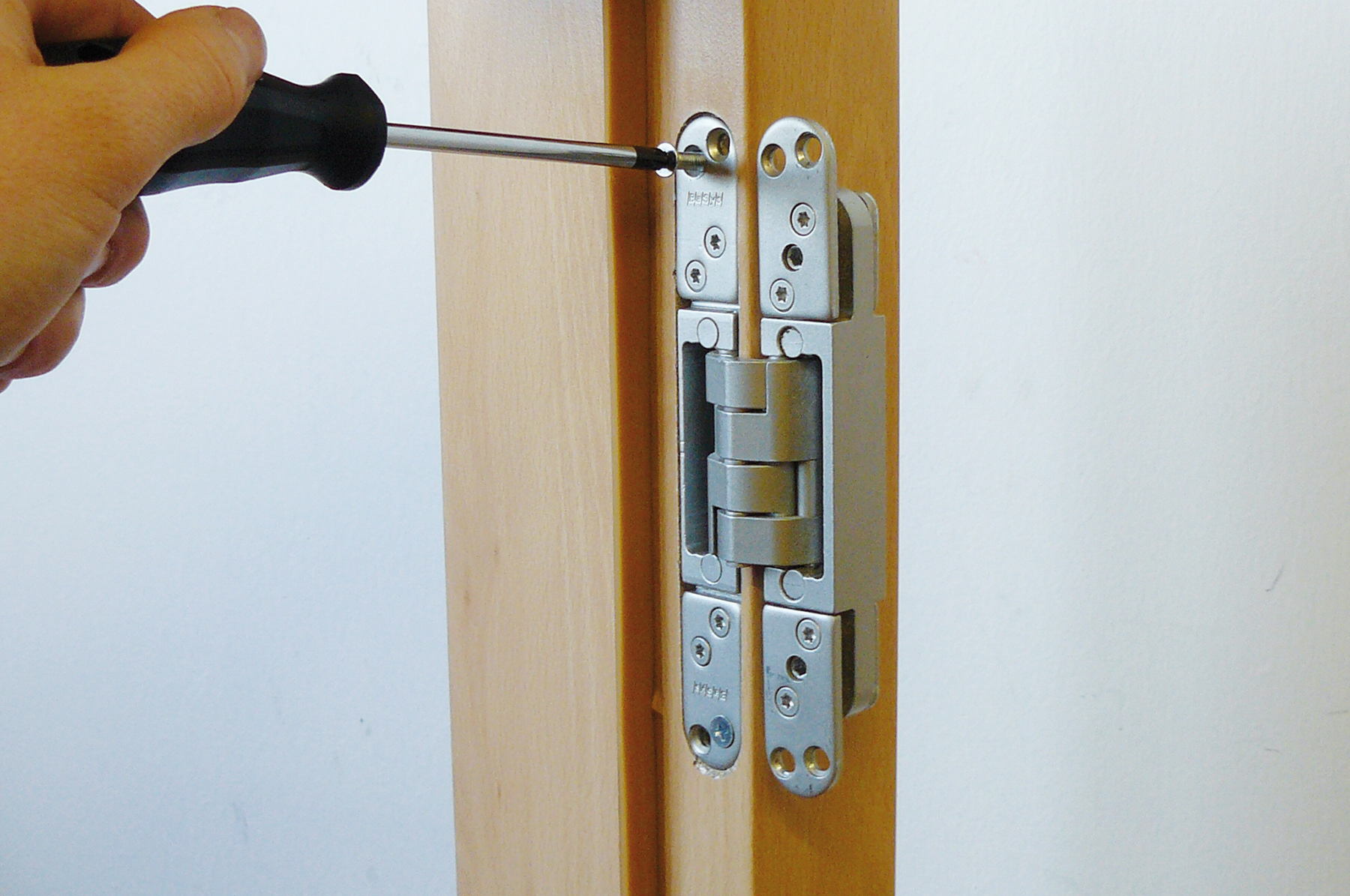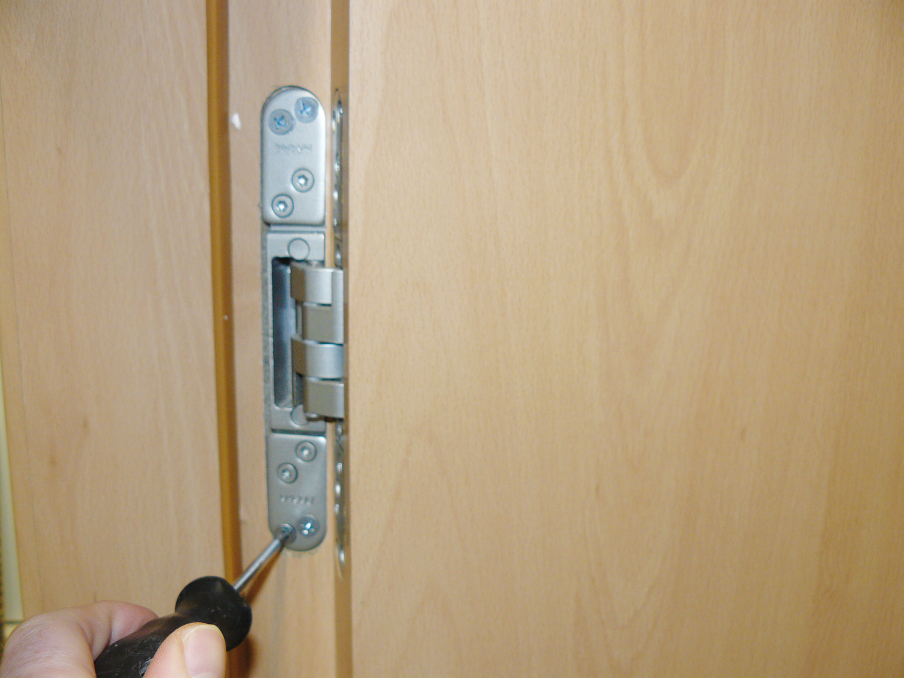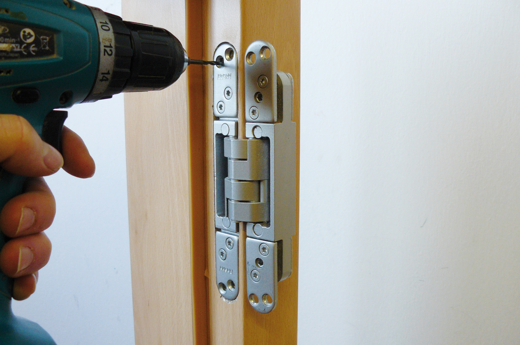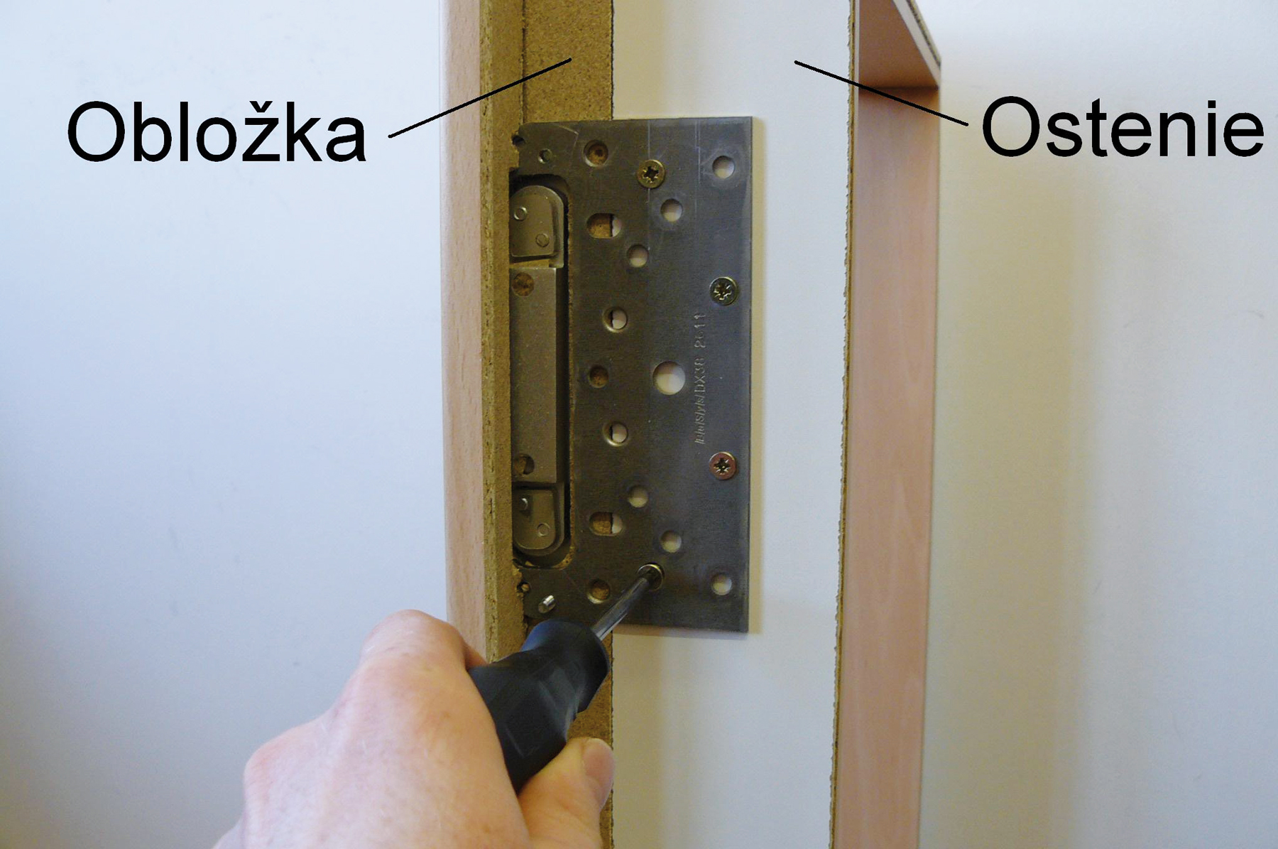 Nasleduje montáž závesov. Záves sa vloží do vyfrézovaného otvoru v zárubni a pomocou vŕtačky s vrtákom s priemerom 5 mm sa prevŕtajú otvory na metrické skrutky. Na rubovú stranu zárubne sa priloží kotviaci plech a spojí sa pomocou metrických skrutiek so závesom. Po namontovaní závesov sa do ostenia ukotví kotviaci plech skrutkami. Zo zárubne sa demontujú závesy a namontujú sa do dverí. Takto zložená zárubňa sa osadí do stavebného otvoru približne 2 mm nad čistú podlahu a vyrovná sa pomocou rozperiek a klinov. Priestor medzi zárubňou a ostením sa vypení. Po vytvrdnutí peny sa odstránia drevené kliny a rozperky a namontujú sa obložky.