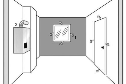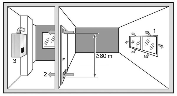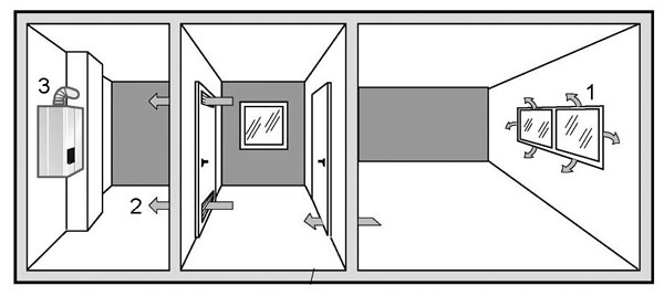 1 – prívod vzduchu z vedľajšej miestnosti prievzdušnosťou škár okna, 2 – prívod vzduchu zo susednej miestnosti otvormi vo dverách, 3 – nástenný plynový otvorený spotrebič