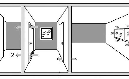 1 – prívod vzduchu z vedľajšej miestnosti prievzdušnosťou škár okna a dverí, 2 – prívod vzduchu zo susednej miestnosti otvormi vo dverách, 3 – nástenný plynový otvorený spotrebič