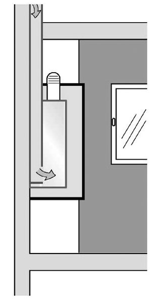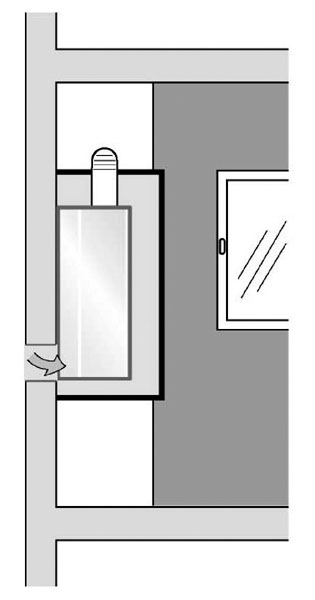 Obr. 3 Umiestnenie nástenného otvoreného spotrebiča v miestnosti s nepriamym prívodom spaľovacieho vzduchu zo susedných miestností