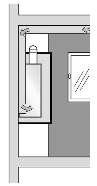 Obr. 2 Umiestnenie nástenného otvoreného spotrebiča v miestnosti s nepriamym prívodom spaľovacieho vzduchu prievzdušnosťou škár okien a dverí zo susednej miestnosti