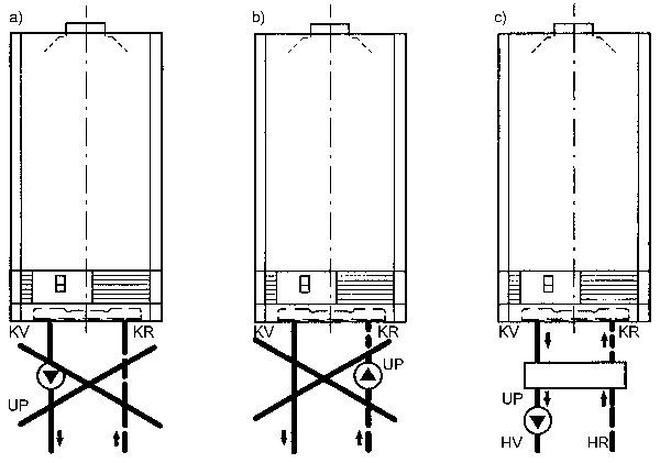 a, b) nesprávne pripojenie kotla na vykurovaciu sústavu, c) správne pripojenie kotla na vykurovaciu sústavu