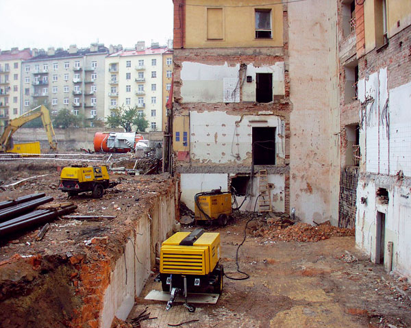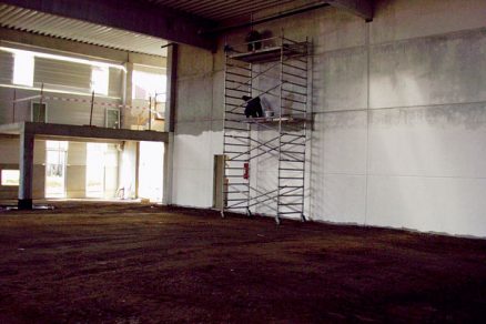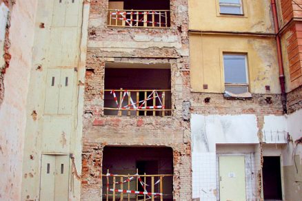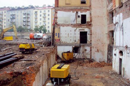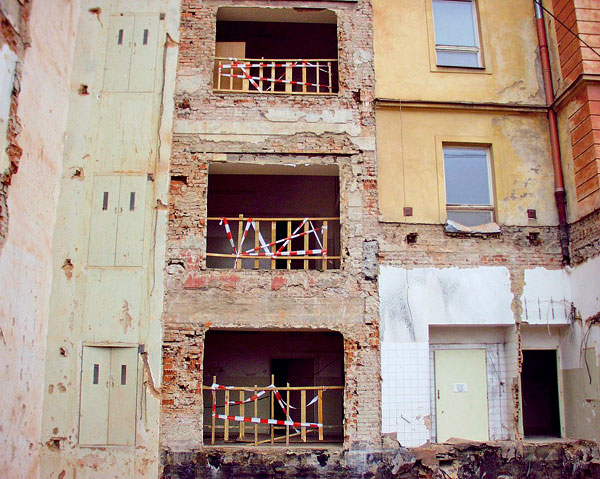| Nezaistená hrana steny v priebehu prác | Pracovník na lešení s osobným istením bezpečnostným pásom |