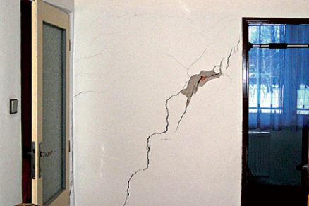 Vzhľadom na uvedené už krátko po odovzdaní bytového domu do užívania začalo dochádzať k jeho nerovnomernému sadaniu. Táto situácia sa údajne vyskytla pri všetkých bytových domoch tohto typu v oblasti. V prípade riešeného objektu však boli dosahy na konštrukciu najvýraznejšie. Postupne vznikali trhliny v nosných stenách a priečkach prakticky vo všetkých smeroch (obr. 2). Charakter a šírka trhlín naznačovali, že k najväčšiemu dosadnutiu došlo pod krajným pásovým základom na severozápadnej strane objektu. Sadanie nebolo kontinuálne, údajne boli zaznamenané dve výrazné dosadnutia – v roku 1994 (následne spracovaný inženierskogeologický prieskum a prvý projekt sanácie) a v roku 2005 (spracovaný druhý projekt sanácie). Sadanie objektu je pripisované prítomnosti nerovnomerne rozmiestnených pieskových polôh v podloží. Blízkosť toku rieky Nitra bezprostredne ovplyvňuje sezónne výkyvy hladiny podzemnej vody. Výrazný pohyb podzemnej vody potom môže spôsobovať sufóziu (vyplavovanie jemných frakcií) v pieskových polohách.
