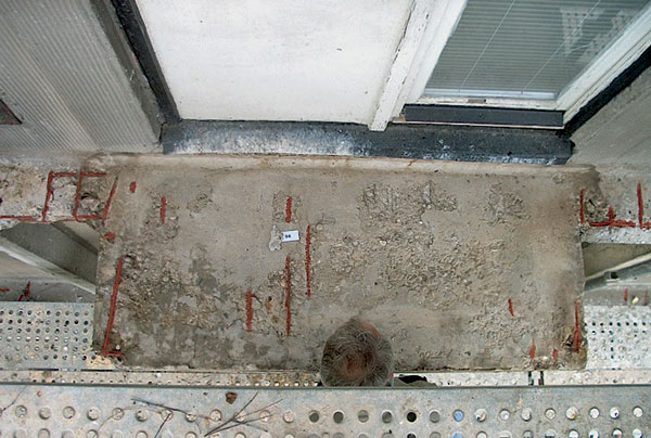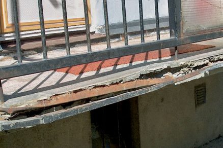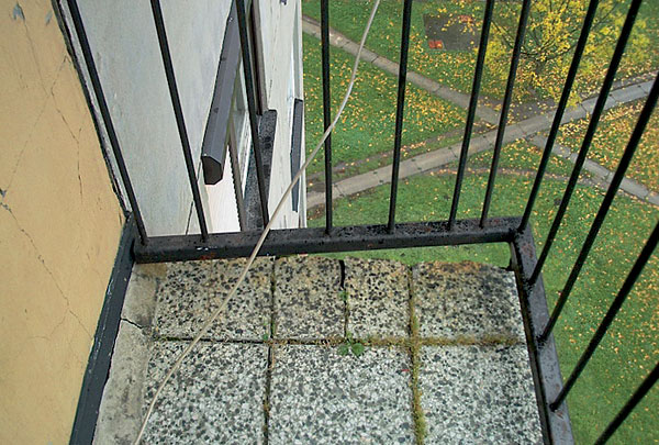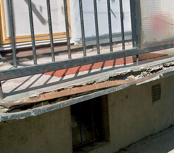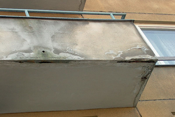 | Pohľad na nesprávne „obnovený“ balkón – nosná doska ponechaná bez reprofilácie a ošetrenia obnaženej výstuže, nové oplechovanie, výplň a náter zábradlia |
