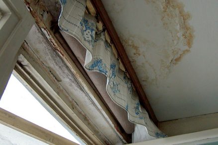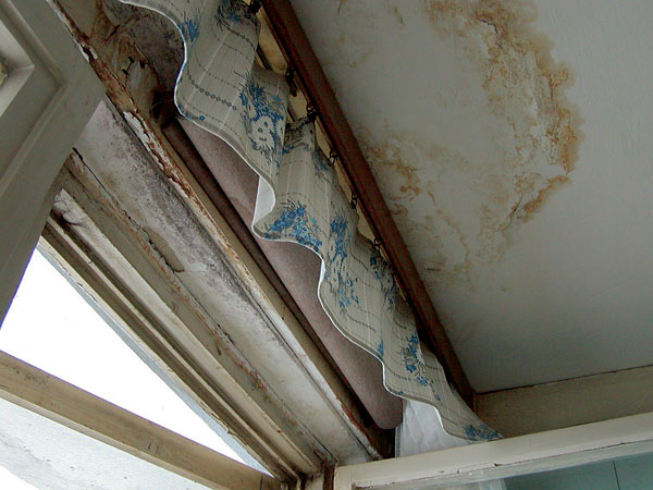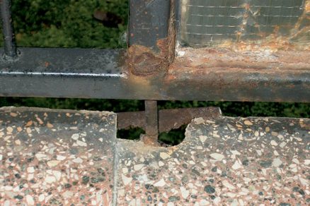 Pohľad na nedostatky plného balkónového zábradlia (kotvenie držadla zhora cez oplechovanie, nevhodne riešený chrlič, nedostatočný odkvapový nos) s následnými zátekmi a degradáciou nosnej dosky a samotného zábradlia (T 06 B BB) |